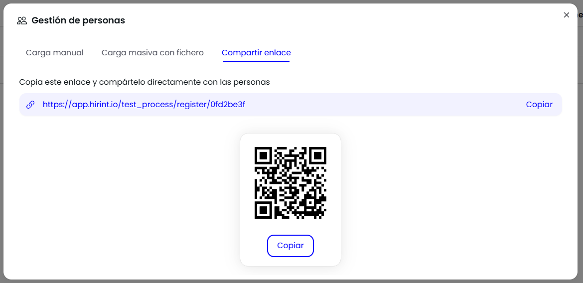 Al hacer clic en Activar evaluación, se abrirá la opción de Gestión de personas, lo que te permitirá invitar a los candidatos de tres maneras: