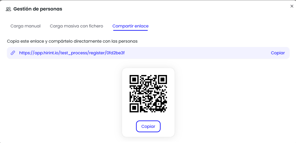 3. Copiar enlace o QR: Otra opción para enviar la prueba es copiando y compartiendo el enlace de manera individual o el QR de la prueba. Nuestros test pueden ser completados desde cualquier dispositivo.