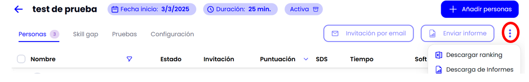 En los tres puntos ubicados en la parte superior derecha, podrás descargar un archivo Excel con el ranking y las puntuaciones de cada candidato, así como realizar una descarga masiva de informes, los cuales llegarán a tu correo electrónico y se generará un archivo comprimido (ZIP).