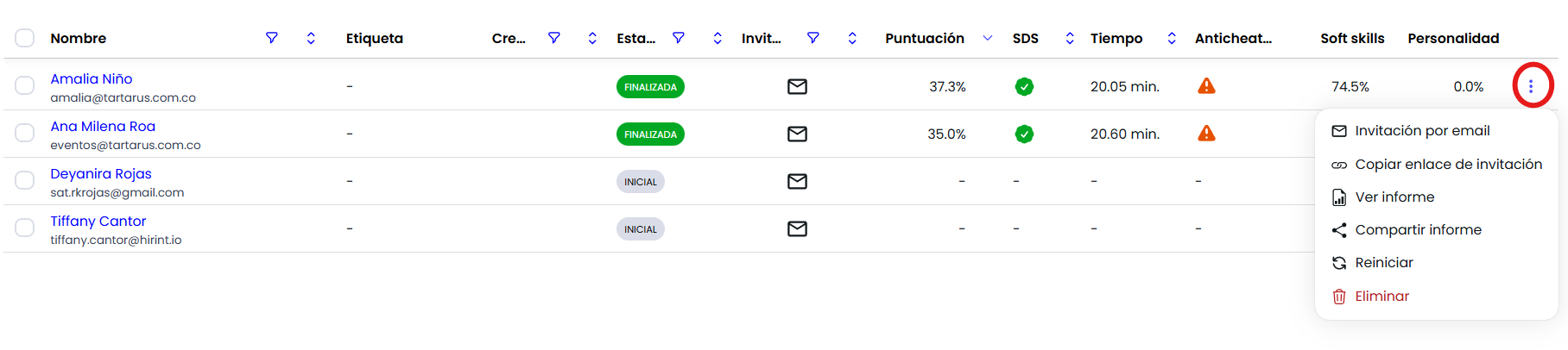 Al hacer clic, accederás al listado de candidatos, donde podrás consultar el estado de la evaluación, la puntuación, la duración de la prueba y los resultados de cada test. Al seleccionar el icono de los tres puntos, se habilitarán las siguientes opciones: